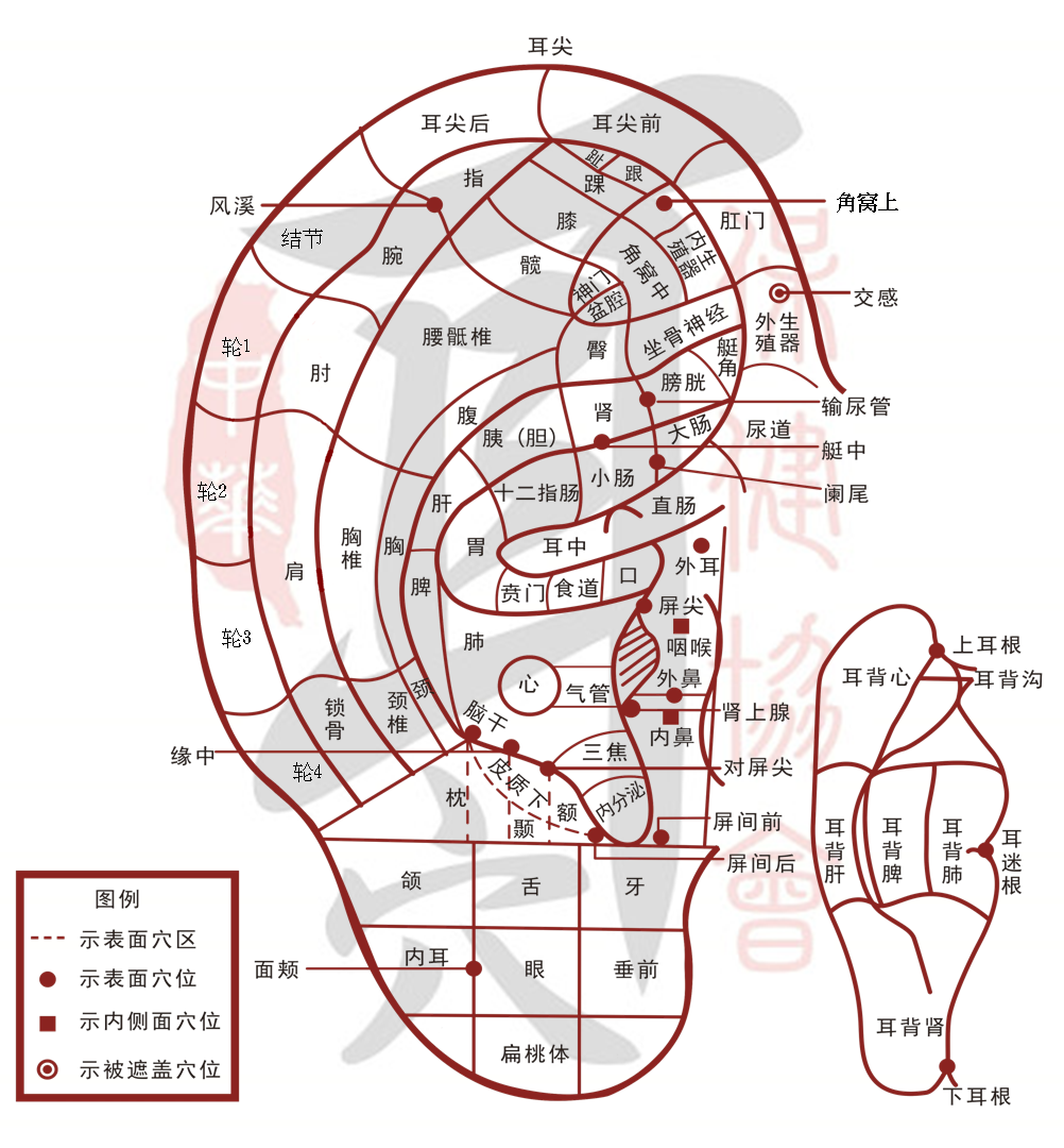 法國醫學博士Paul Nogier認為耳朵與內臟器官有密切關聯,當身體有任何不適,可在耳朵找到相對反應的位置做調理。因此他在1957年發表「形如胚胎倒影式的耳穴分佈圖譜」,認為耳朵似是為在子宮中倒立的嬰兒樣貌,以全息的概念對應人體各部位,大致可分為頭、軀幹、下肢、上肢、胸腔、腹腔、骨盆腔等,並根據此理論建立更完整的耳穴治療系統。
